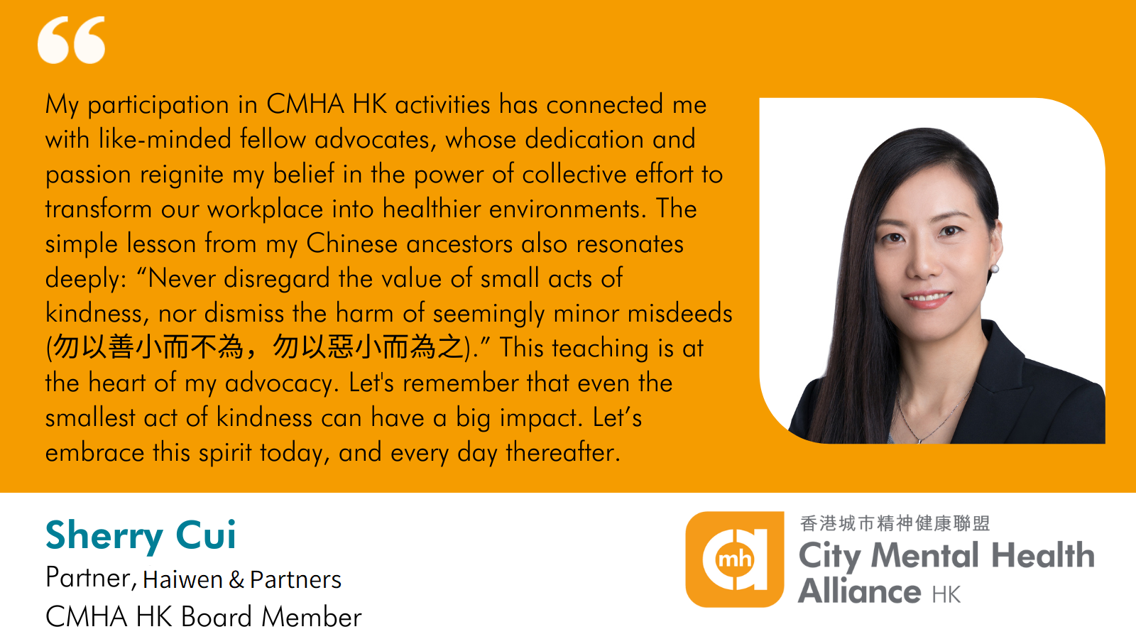 The City Mental Health Alliance Hong Kong (CMHA HK) is a not-for-profit membership organisation. We believe the workplace has an opportunity and a responsibility to protect, support and foster positive mental health for their employees, creating an environment where they can thrive.
